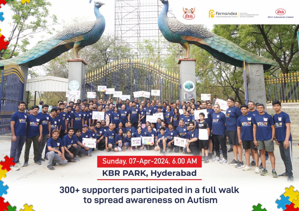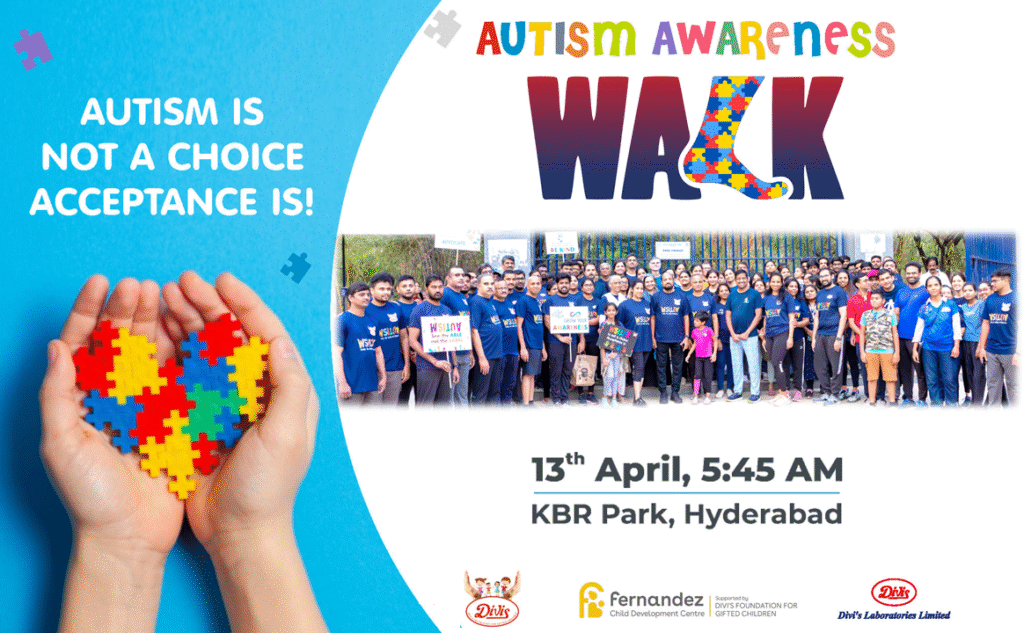 April is observed as Autism Awareness month – a time to recognize and support millions of individuals around the world who are on the autism spectrum. Divi’s Foundation for Gifted Children (DFGC) in partnership with Fernandez child development centre (FCDC) has organized an Autism awareness Walk on 9th April 2023 at the KBR park to come together as a community, have fun, raise awareness and support for individuals with autism More than 500 supporters from Divi’s, FCDC, Families & Friends, Fitness enthusiasts took part by circling a full walk at the KBR park